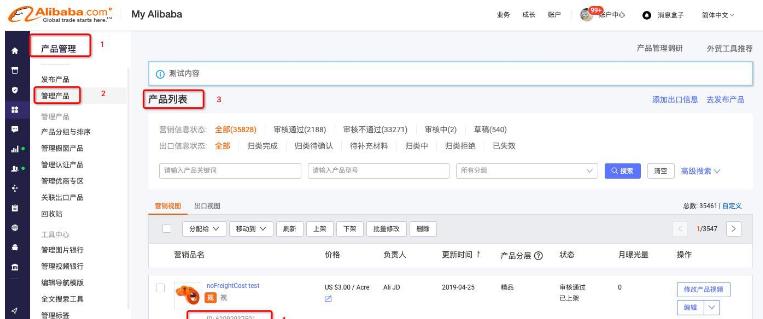 國際站賬號登錄 My Alibaba 后臺,左側(cè)導(dǎo)航欄找到“產(chǎn)品管理”→“管理產(chǎn)品”→“產(chǎn)品列表”→每一個產(chǎn)品下面都有一串數(shù)字,這個就是該商品的ID啦!