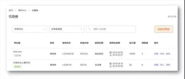 Step1:進入營銷中心>優(yōu)惠券>創(chuàng)建優(yōu)惠券