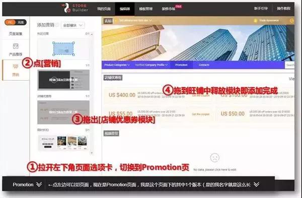 Step3:進入旺鋪2.0裝修后臺>Promotion頁,添加優(yōu)惠券模塊