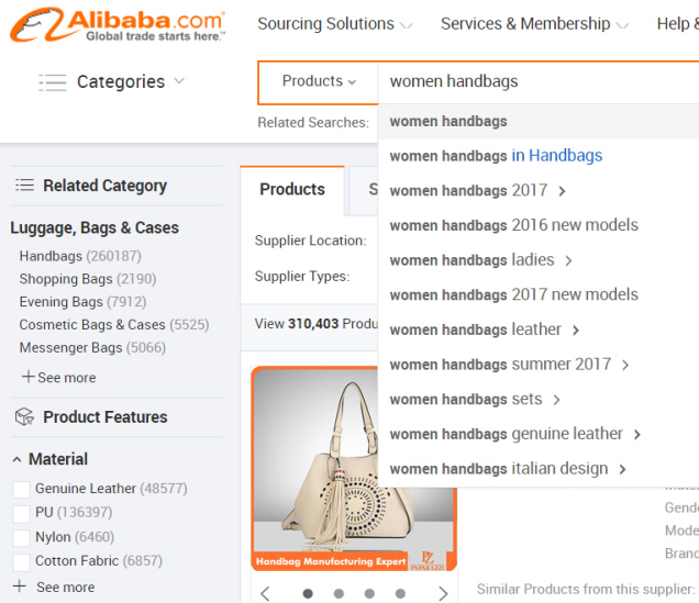 目前阿里巴巴國際站的搜索引擎,主要索引標題、關鍵詞和產(chǎn)品屬性。阿里自2015年逐步引入買家偏好權重,我們可利用這一要素,在發(fā)布產(chǎn)品時利用屬性主動去匹配買家偏好。舉個例子,在alibaba.com搜索women handbags這個關鍵詞,會有相關詞的推薦: