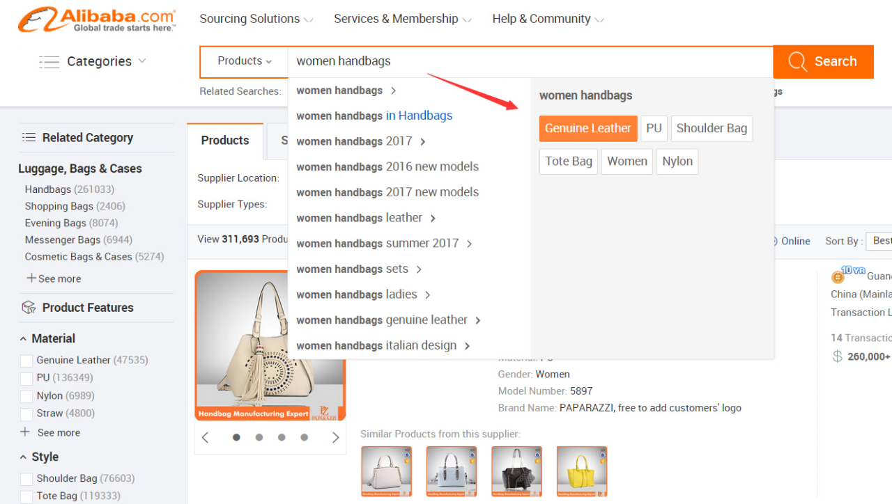 當我們把鼠標放在women handbags上時,下拉框右側會給出擴展詞,比如排在第一位的Genuine Leather: