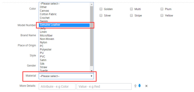 點擊Genuine Leather后篩選出的產(chǎn)品中,系統(tǒng)屬性里的“材質”都會出現(xiàn)Genuine Leather。