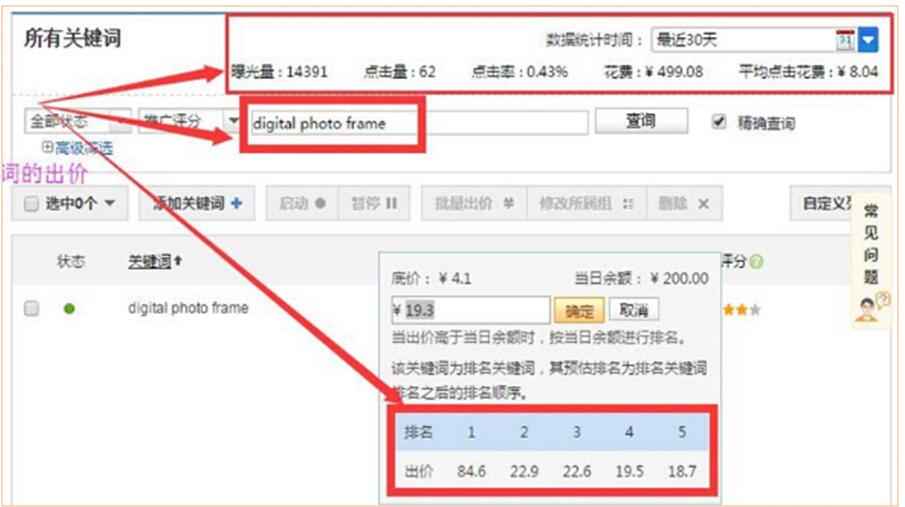 從一個(gè)關(guān)鍵詞競價(jià)對比中,我們可以看到,雖然在曝光量方面,A店鋪要高于B店鋪,但點(diǎn)擊量卻少了2倍多,并且P4P平均單價(jià)低出60%。而且在競價(jià)同一個(gè)名次時(shí),A店鋪的出價(jià)比B店鋪的高出2~3倍。