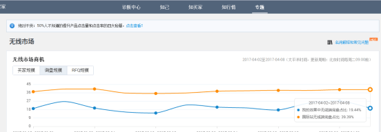 我們以“詢盤規(guī)?!睘槔?,看一下藍(lán)色曲線是“我的效果中無線端詢盤占比”和橙色曲線“國際站無線端詢盤占比”,如圖,橙色數(shù)字是39.39%,表示整個國際站無線端詢盤占了近4成,藍(lán)色19.44%,說明自己的無線端詢盤占比只有不到2成。也就是說,藍(lán)色曲線在橙色線的下面,也就是說明“你無線端詢盤流量”不如“行業(yè)平均值”。