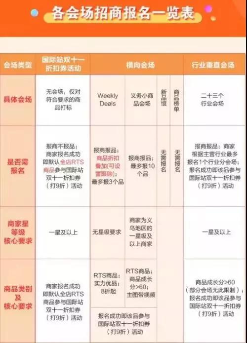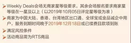 對(duì)于招商報(bào)名門(mén)檻,參加活動(dòng)商品需是滿足風(fēng)控條件的RTS商品,其中Weekly Deals會(huì)場(chǎng)無(wú)商家星等級(jí)要求,其余會(huì)場(chǎng)報(bào)名要求商家星等級(jí)在一星以上。并且參與此次雙11活動(dòng)的所有商家為中國(guó)大陸、香港臺(tái)灣地區(qū)出口通、全球?qū)毣蚪鹌氛\(chéng)企中用戶。