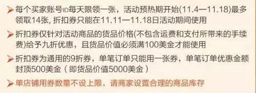 另外,今年阿里國(guó)際站給出的雙11折扣券買(mǎi)家使用規(guī)則顯示,此次活動(dòng)期間使用的折扣券為通用的9折券,是針對(duì)活動(dòng)商品的貨品價(jià)格(不包含運(yùn)費(fèi)和支付所帶來(lái)的手續(xù)費(fèi))給予九折優(yōu)惠,且貨品價(jià)值必須滿100美金才能使用。并且,每個(gè)買(mǎi)家賬號(hào)id每天限領(lǐng)一張,活動(dòng)預(yù)熱期間(11.4—11.18)最多領(lǐng)取14張。