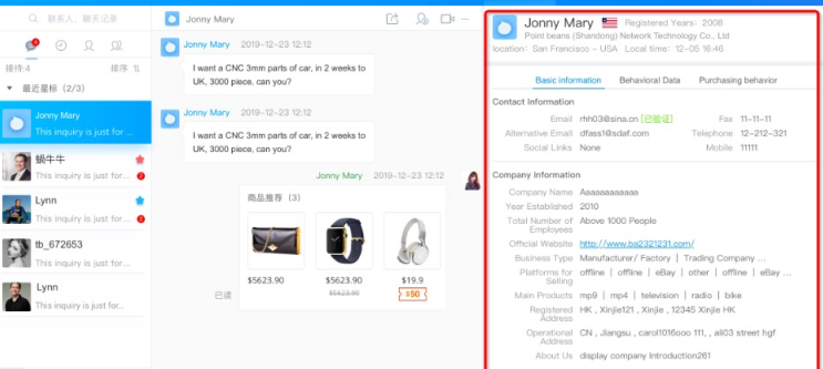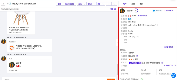 如果說商機(jī)列表頁的信息讓你對(duì)買家有了第一印象,進(jìn)入到詢盤詳情頁后,通過右側(cè)的客戶列表,你將獲取到更多跟買家相關(guān)的信息,對(duì)報(bào)價(jià)和跟進(jìn)策略有非常大的影響,網(wǎng)上有很多客戶身份分析的方法,比如通過email搜索,Googlemap定位等等,這里我們就不多說了,大家有興趣可以去網(wǎng)上搜一下,這里需要提到的是有些時(shí)候買家的信息設(shè)置了隱藏,很多信息就看不到了,這個(gè)問題我們?cè)诿粨Q章節(jié)會(huì)告訴大家如何破解