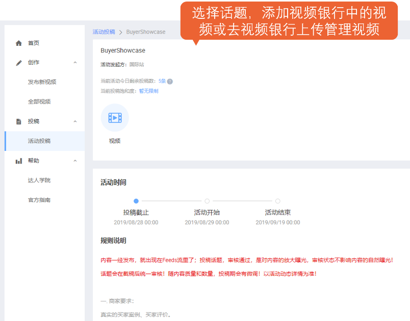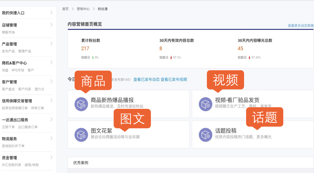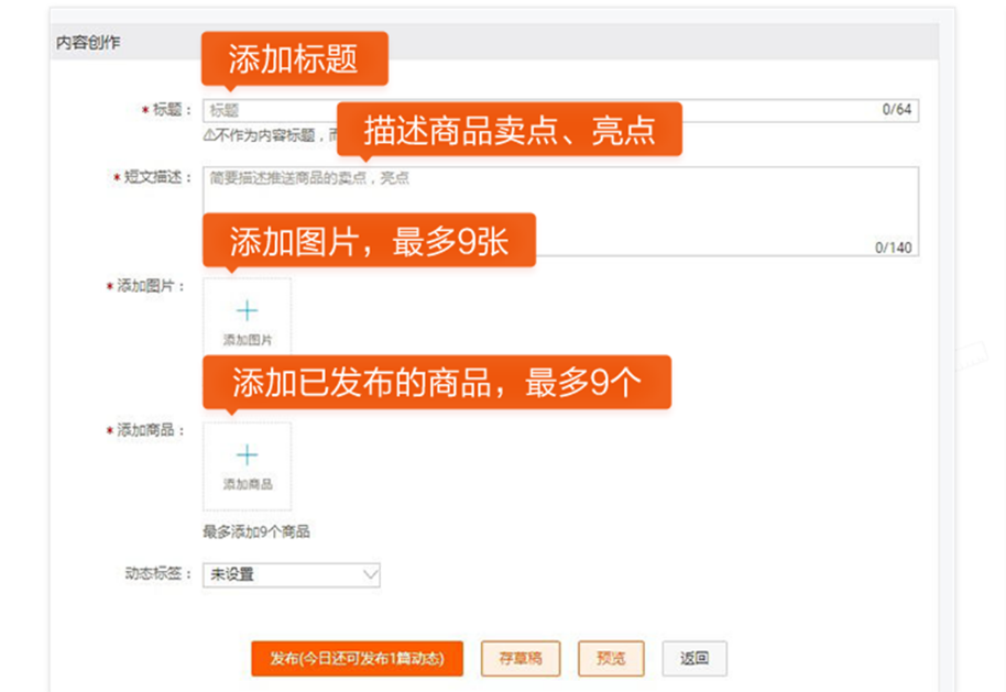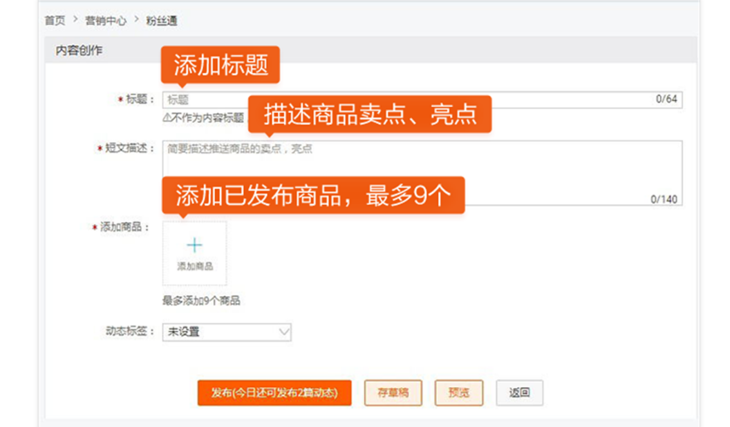 在粉絲通頁面上(MA→營銷中心 →粉絲通),現(xiàn)在支持發(fā)布三種形式的動態(tài):商品、視頻、圖文,以及參與話題投稿活動。