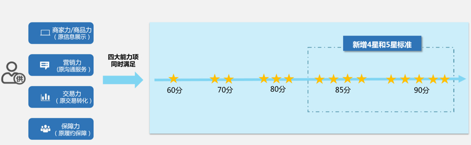 豐富指標(biāo)體系,強(qiáng)調(diào)買家核心關(guān)注點(diǎn),四大能力項(xiàng)一次升級(jí)為:商家力/商品力、營(yíng)銷力、交易力、保障力;②.細(xì)化分層標(biāo)準(zhǔn),凸顯更多優(yōu)質(zhì)商家,在3星之上孵化出4、5星。1-5星四大能力項(xiàng)分?jǐn)?shù)要求分別是60-70-80-85-90.(可見圖)