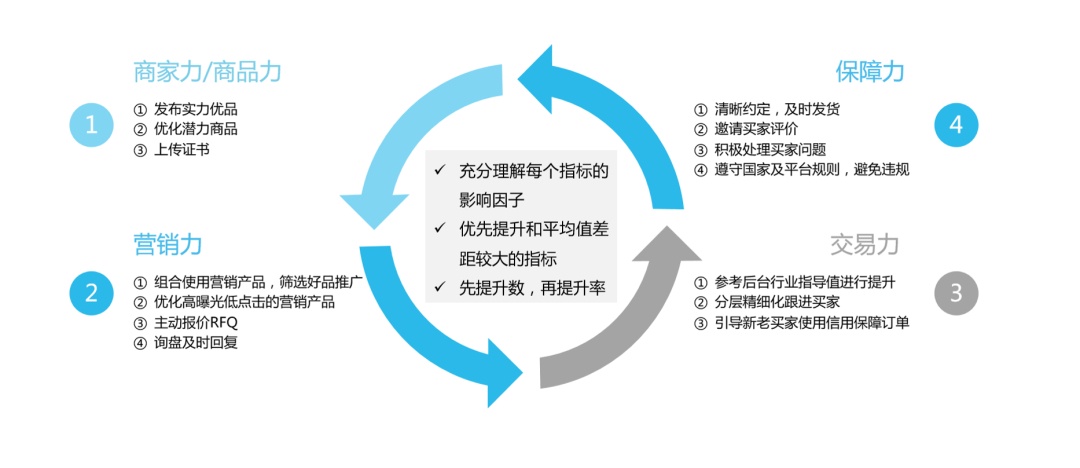 針對(duì)先易后難,在商家力/商品力和保障力是基礎(chǔ),也是相對(duì)容易的提分項(xiàng),如這兩項(xiàng)沒有達(dá)到60分,應(yīng)首先進(jìn)行優(yōu)化提升。營(yíng)銷力是商家多場(chǎng)景觸達(dá)買家的能力體現(xiàn),需要商家不斷地花費(fèi)心思進(jìn)行優(yōu)化,并通過(guò)時(shí)間沉淀展現(xiàn)。交易力是最終效果的直接體現(xiàn),繩鋸木斷、水滴石穿,只有在平臺(tái)上不斷地耕耘,才會(huì)有巨大的收獲。