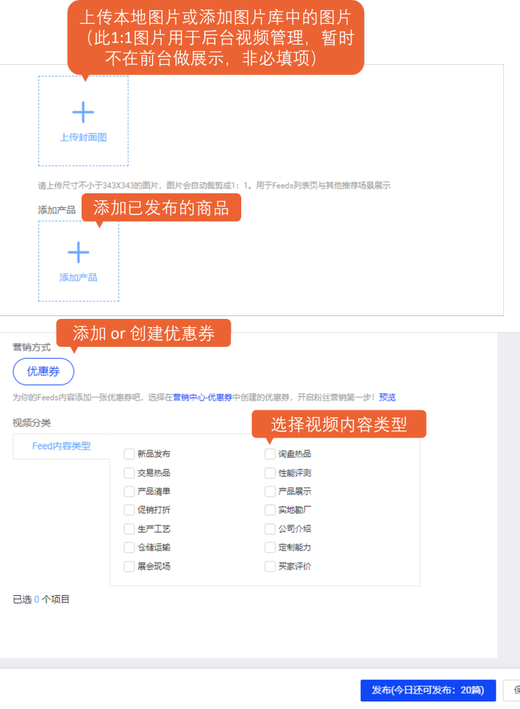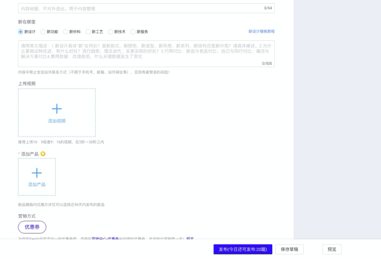 添加視頻完畢后繼續(xù)進(jìn)行產(chǎn)品、優(yōu)惠券的添加: