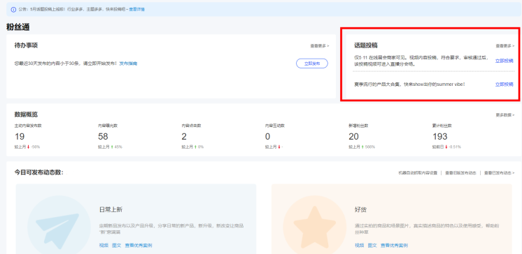 入口二:MA-營(yíng)銷(xiāo)中心-粉絲通-話(huà)題列表,直接看到所有話(huà)題,挑選合適的進(jìn)行投稿吧~投稿前一定要閱讀投稿要求,投稿符合話(huà)題主題、質(zhì)量高的視頻。