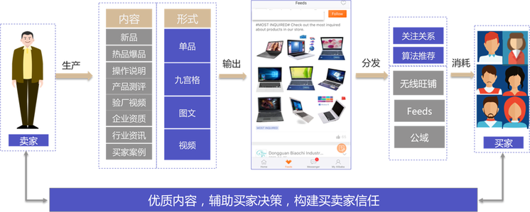 內(nèi)容消耗,即最終被買家看見。用優(yōu)質(zhì)內(nèi)容建立買賣家之間有回訪有粘性的新型關(guān)系,輔助買家決策。