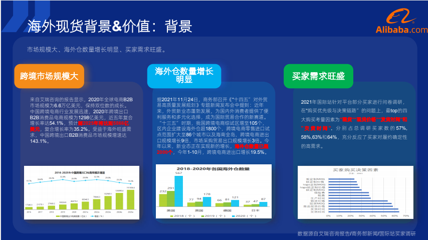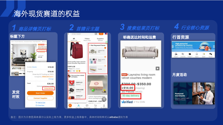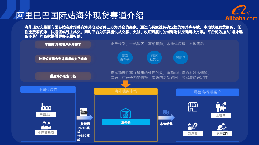 海外現(xiàn)貨交易面向國際站商家招募有海外倉或者第三方海外倉的商家,通過向買家透傳確定性的海外庫存數(shù),本地快速發(fā)貨到貨,低物流費(fèi)等優(yōu)勢,快速促成線上成交,同時平臺為買賣提供從交易、支付、收匯到履約的端到端供應(yīng)鏈解決方案。平臺將為加入"海外現(xiàn)貨交易”的商家提供更多專屬權(quán)益。