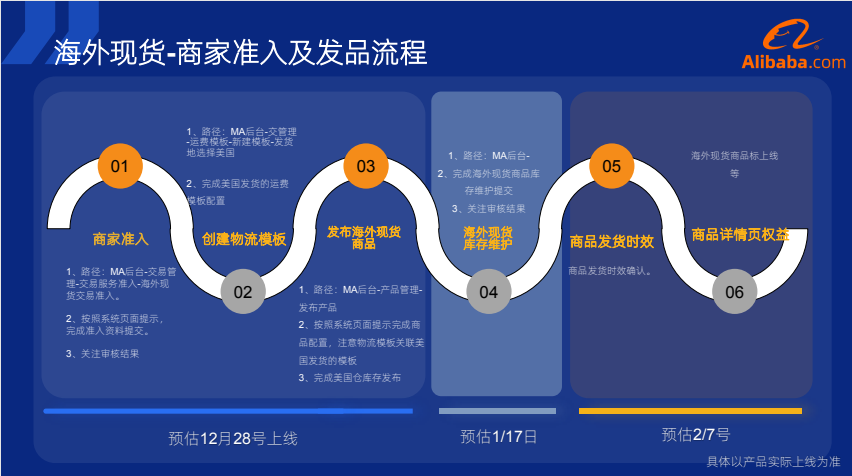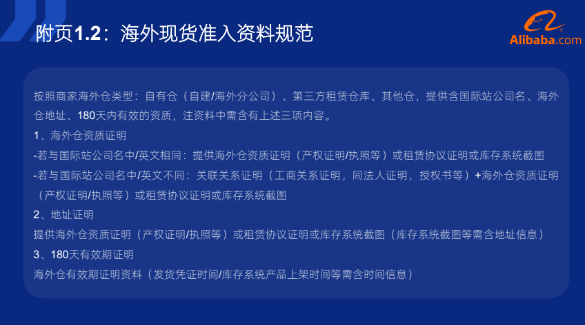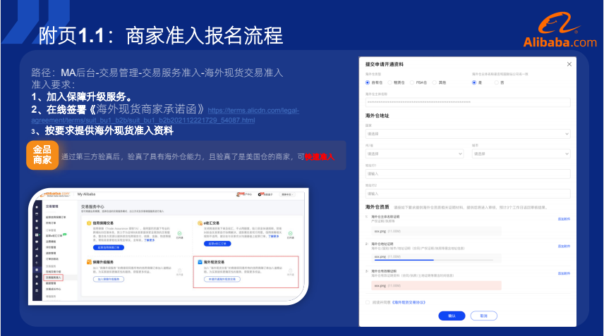 商家準(zhǔn)入路徑:【My Alibaba】-交易管理-交易服務(wù)準(zhǔn)入-海外現(xiàn)貨交易準(zhǔn)入,https://bao.alibaba.com/bao/serviceCenter.htm