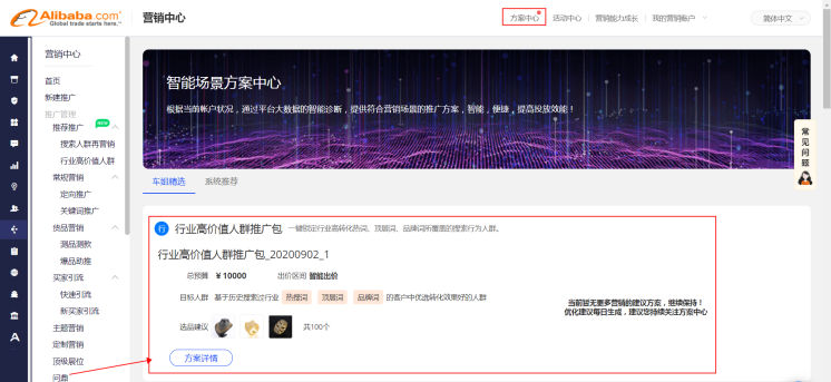 第一步:點擊進入方案中心,找到行業(yè)高價值人群推廣,點擊方案詳情