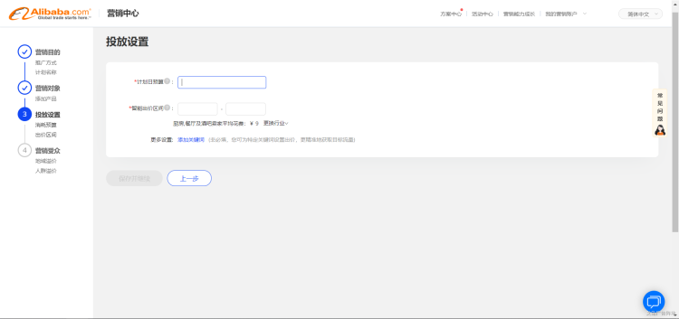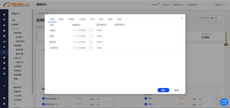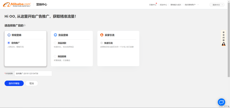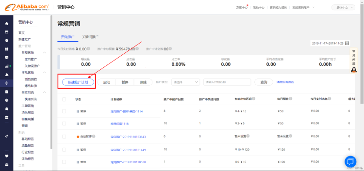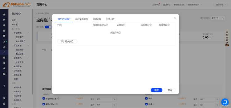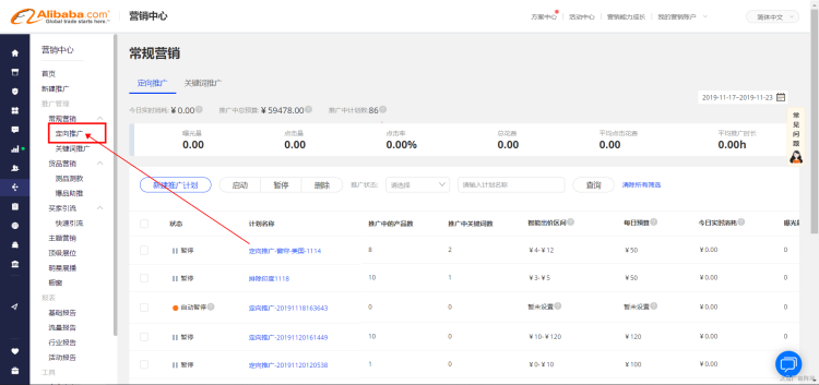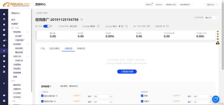 打開營銷中心后,點(diǎn)擊進(jìn)入到外貿(mào)直通車首頁,點(diǎn)擊左側(cè)導(dǎo)航欄“定向推 廣”