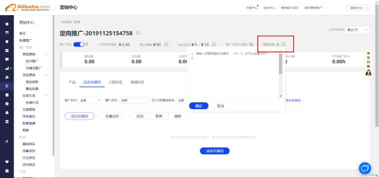 8.屏蔽詞設(shè)置:在輸入框直接輸入您針對該計(jì)劃內(nèi)的產(chǎn)品想要屏蔽的買家搜索詞。