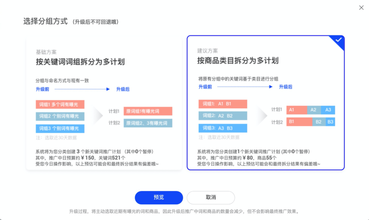 3月后,再升級為新版的關(guān)鍵詞推廣商家,系統(tǒng)將根據(jù)您歷史的分組信息,為您生成多個(gè)計(jì)劃,便于您進(jìn)行分別管理;