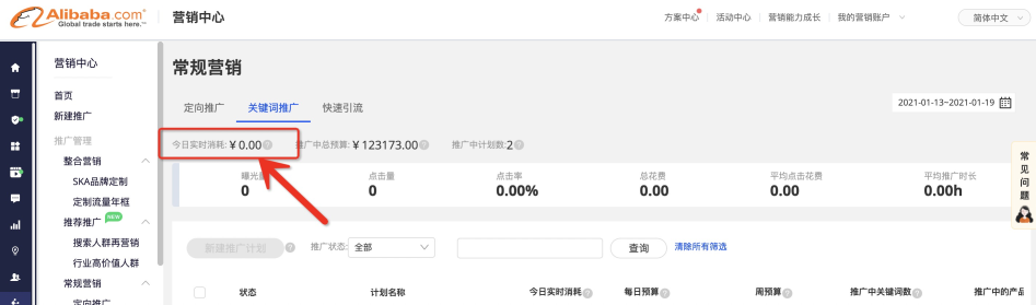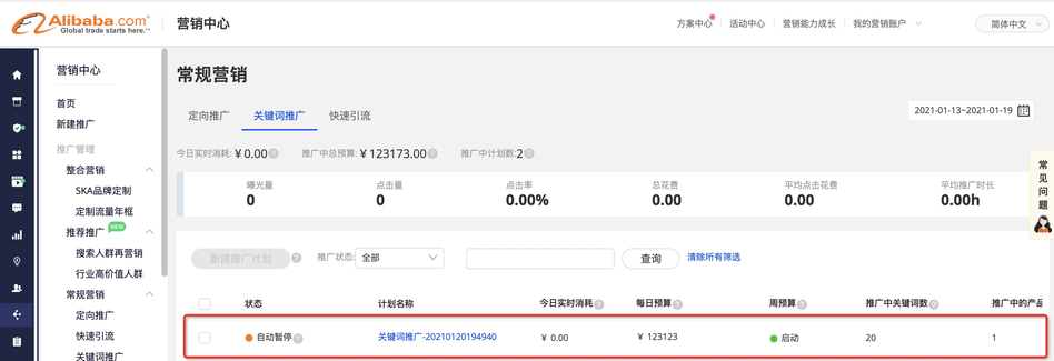 完成升級后,點(diǎn)擊導(dǎo)航【關(guān)鍵詞推廣】,即可看到當(dāng)前的計(jì)劃列表;