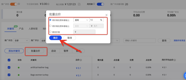 可選擇本頁全部關(guān)鍵詞,完成批量出價(jià)