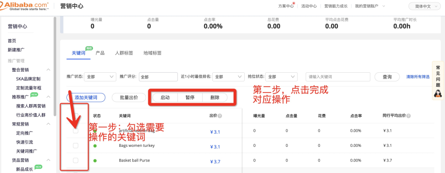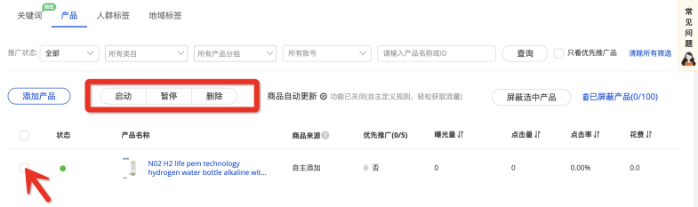 您可以先勾選商品,再點(diǎn)擊啟動(dòng)、暫停或刪除,完成批量操作;