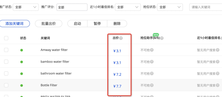 依次展示:關(guān)鍵詞、出價(jià)、搶位狀態(tài)、近1小時(shí)最佳排名、24小時(shí)排名分布、推廣產(chǎn)品數(shù)(該關(guān)鍵詞當(dāng)前關(guān)聯(lián)產(chǎn)品數(shù))、該關(guān)鍵詞推廣評分、該關(guān)鍵詞搜索熱度、購買競爭度、曝光、點(diǎn)擊、詞花費(fèi)、點(diǎn)擊率、該關(guān)鍵詞同行平均出價(jià);