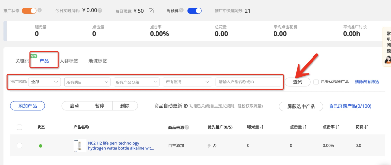可根據(jù)當(dāng)前商品的推廣狀態(tài)、當(dāng)前商品的發(fā)布類目、您自身針對商品的分組、以及操作人員賬號、或輸入產(chǎn)品名稱或者商品ID,點(diǎn)擊查詢,即可完成計(jì)劃商品篩選;商品名稱輸入匹配不分大小寫;