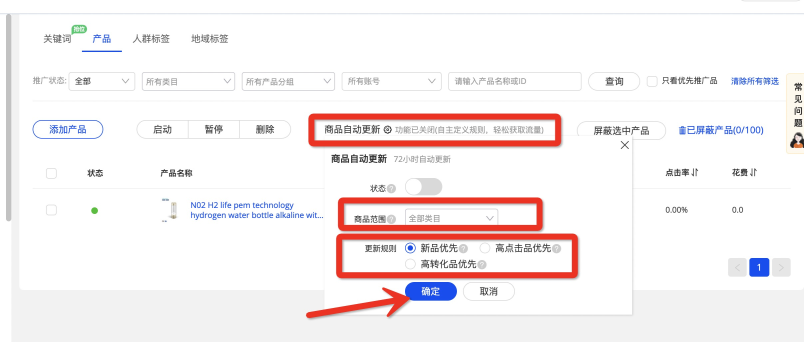 添加方式2:您可以點(diǎn)擊【商品自動(dòng)更新】,設(shè)置不同類目商品自動(dòng)更新加入計(jì)劃(新品優(yōu)先、高轉(zhuǎn)化優(yōu)先、高點(diǎn)擊優(yōu)先);