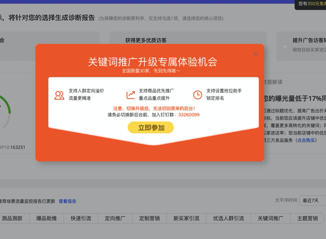 目前僅針對當(dāng)前推廣中的關(guān)鍵詞數(shù)量較少的商家開放內(nèi)測,如您未收到邀請,請您靜靜等待,預(yù)計(jì)2月底將逐步開放;