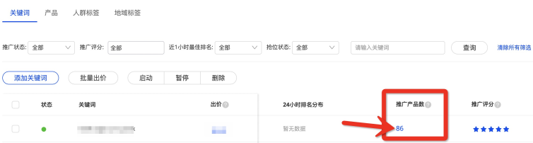 點(diǎn)擊【推廣產(chǎn)品數(shù)】下方的數(shù)字,即可查看當(dāng)前該關(guān)鍵詞所關(guān)聯(lián)的對應(yīng)商品;(此處不可設(shè)置優(yōu)先推廣)