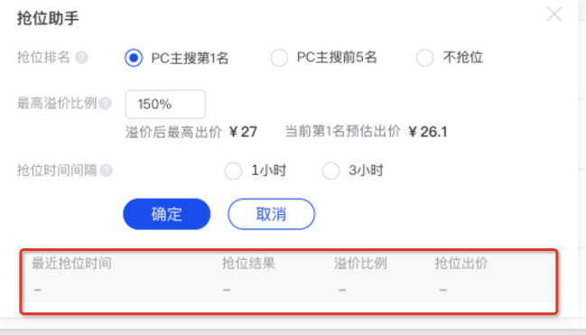搶位助手會在生效時間為您改價、嘗試出價,具體是否能夠搶到預(yù)期位置,與您的底價、溢價率以及對應(yīng)競價時間區(qū)間內(nèi),大盤的競爭情況相關(guān);如未搶到,則會按您的底價進(jìn)行出價;