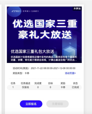 該權益為定向邀約,僅限報名上方活動后,且該“優(yōu)選國家”計劃投放效果有提升的商家,才有機會獲得該權益。