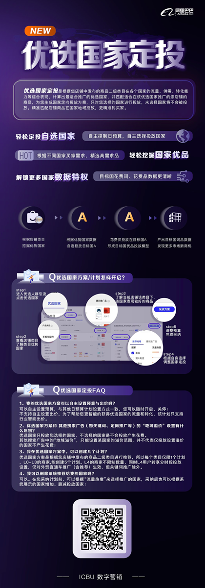 “優(yōu)選國家”定投方案是根據您店鋪中發(fā)布的商品二級類目在各個國家的流量、供需、轉化能力等綜合表現(xiàn),計算出最適合推廣的優(yōu)選國家,并匹配您的店鋪商品,為您生成國家定向投放方案。只在您選擇的國家進行投放,未選擇國家不投放。現(xiàn)在開啟計劃就可以獲得三重禮包,更多優(yōu)惠,嘗鮮使用。