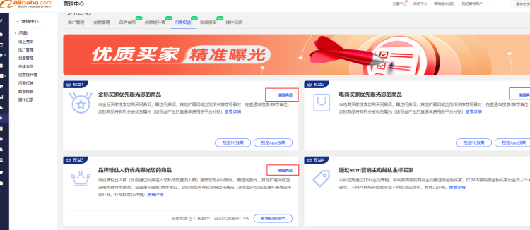 進入營銷中心-問鼎后臺-問鼎權(quán)益,如下圖1點擊權(quán)益1/2/3任意一個板塊右上角的“編輯商品按鈕”,
