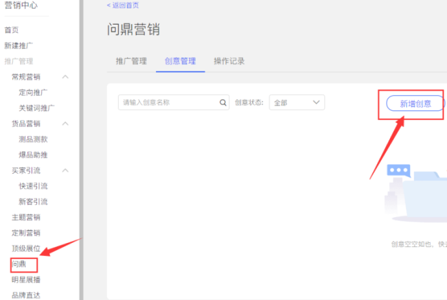 進(jìn)入直通車營銷中心-右側(cè)導(dǎo)航選擇問鼎-進(jìn)入問鼎主頁-選擇創(chuàng)意管理-點(diǎn)擊新增創(chuàng)意