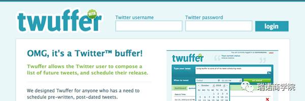 Twuffer是另一個定時twitter發(fā)布工具,界面很簡單,功能也很簡單,但是對于簡單的預(yù)發(fā)布已經(jīng)足夠了。也許你不需要多個賬號,也許你不 需要那些復(fù)雜的數(shù)據(jù)統(tǒng)計,也許你只是想把一些消息定時發(fā)布,比如你有新的產(chǎn)品在半夜上線,也許你的粉絲們和你處在不同的時區(qū),那么Twuffer就足夠了!