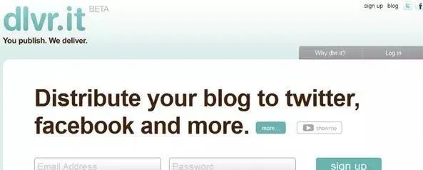 DLVR的作用很強大,可以把你的博客文章自動發(fā)布到Twitter及Facebook上,同時還支持LinkedIn, Google Buzz, MySpace, Status.net等等開放的社交網(wǎng)站。不單單博客,只要是RSS文件,都可以提交到dlvr上,每當(dāng)RSS有更新,都會自動發(fā)布到你關(guān)聯(lián)的賬號上!支 持Bit.ly,方便統(tǒng)計點擊。這個工具的作用不單單是發(fā)布博客,你還可以注冊一些fake賬號,用來發(fā)布外鏈促進(jìn)收錄。方法是先將外鏈制作成RSS,然 后提交即可!