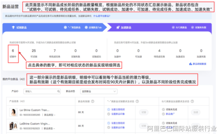 商品數(shù)配額:每個店鋪初始都有5個新品運營配額,即商家可選擇5個新品開啟試銷、加速(即流量扶持,持續(xù)14天),如其中有商品試銷/加速失敗,則空出名額,可選擇其他商品進行試銷/加速。